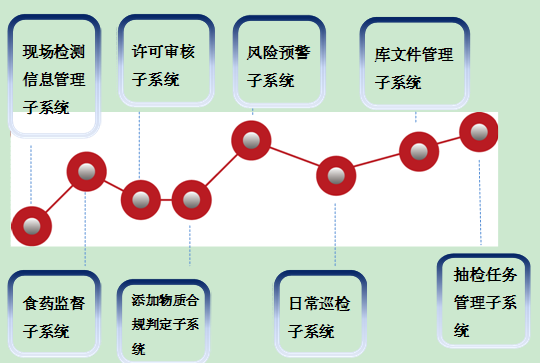系統(tǒng)功能:現(xiàn)場(chǎng)檢測(cè)信息管理子系統(tǒng)、食藥監(jiān)督子系統(tǒng)、許可審核子系統(tǒng)、日常巡檢子系統(tǒng)、風(fēng)險(xiǎn)預(yù)警子系統(tǒng)、添加物質(zhì)合規(guī)判定子系統(tǒng)、庫(kù)文件管理子系統(tǒng)、抽檢任務(wù)管理子系統(tǒng)等八大版塊內(nèi)容主體。