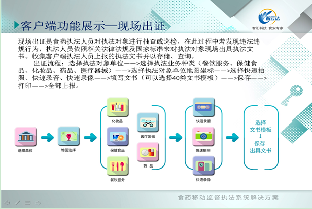 食藥移動(dòng)監(jiān)督執(zhí)法系統(tǒng)是食品藥品監(jiān)督管理領(lǐng)域移動(dòng)監(jiān)督執(zhí)法綜合服務(wù)系統(tǒng),主要用于食品藥品監(jiān)督管理部門移動(dòng)監(jiān)管執(zhí)法使用。執(zhí)法人員可以手持客戶端現(xiàn)場(chǎng)檢測(cè),錄像、錄音拍照等證據(jù)獲取,并依照法律法規(guī)對(duì)監(jiān)管對(duì)象進(jìn)行動(dòng)態(tài)出證、等級(jí)評(píng)審、許可審核和日常巡檢等業(yè)務(wù)工作處理,并上報(bào)處理結(jié)果數(shù)據(jù)。監(jiān)管人員根據(jù)執(zhí)法采集的數(shù)據(jù),及系統(tǒng)自動(dòng)收集到的輿情信息,實(shí)現(xiàn)了食藥監(jiān)管部門對(duì)所轄區(qū)內(nèi)的食品安全問(wèn)題重點(diǎn)監(jiān)管工作。