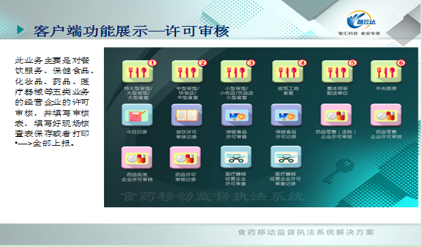 業(yè)務(wù)組成:分為云平臺(tái)中心管理系統(tǒng)和食安寶(移動(dòng)執(zhí)法包客戶端)。主要業(yè)務(wù)監(jiān)管餐飲服務(wù)、保健食品、藥品、醫(yī)療器械、化妝品等五類業(yè)務(wù)。