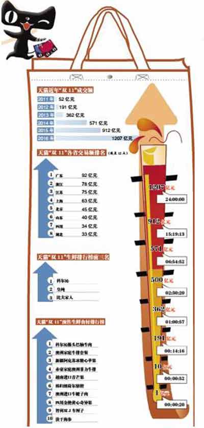 2016年的天貓“雙11”購物狂歡節(jié)已正式落下帷幕,全天總交易額達(dá)到了1207.49億元,其中無線交易額占比81.87%,交易覆蓋235個(gè)國家和地區(qū)。這是繼2015年912億元、2014年571億元之后,又一次刷新的成交額記錄。其他電商平臺(tái)如京東等,在此次“雙11”中也是戰(zhàn)績斐然,連創(chuàng)新高。