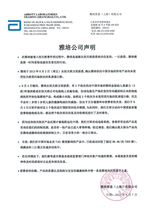 恒天然CEO在發(fā)布會(huì)上曝出的不愿透露名字的客戶,6日晚間最終確認(rèn)是雅培。中國(guó)網(wǎng)消費(fèi)頻道記者給雅培發(fā)去采訪提綱,問及隱瞞身份的初衷。7日晚間23:10,雅培給予回復(fù)。聲明中,雅培并未承認(rèn)隱瞞身份,而是強(qiáng)調(diào)在雅培被卷入恒天然事件的過程中,雅培是逐漸從恒天然獲悉相關(guān)信息的。一旦獲悉,雅培都是第一時(shí)間采取迅速而負(fù)責(zé)任的行動(dòng)。
