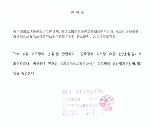 12月20日,1號店方面向澎湃新聞?dòng)浾哒f明,韓國廠家確認(rèn)了國內(nèi)經(jīng)銷商的說法,出口巢尚食品的湯姆農(nóng)場產(chǎn)品外包裝所標(biāo)日期為生產(chǎn)日期,并出具了說明函。