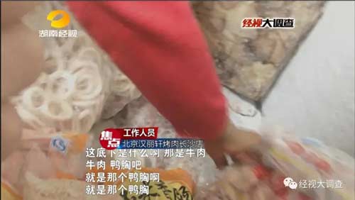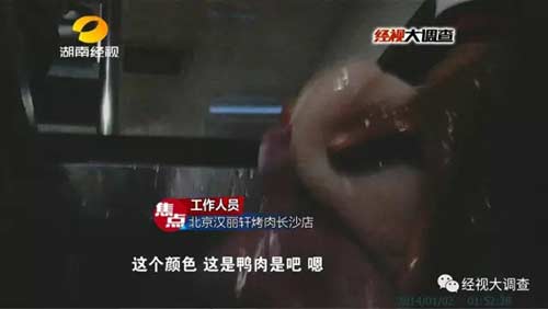北京漢麗軒烤肉店遍布全國,可是在長沙這家店我們憤怒的看到,店里的所謂牛肉都是用鴨肉偽造,甚至還摻入變質(zhì)的鴨肉,而且造假用的鴨肉都是統(tǒng)一配送過來的。若不是記者長時(shí)間辛苦的臥底調(diào)查,誰能知道其中真相!消費(fèi)者會(huì)永遠(yuǎn)被蒙蔽,欺詐伎倆會(huì)永遠(yuǎn)繼續(xù),漢麗軒會(huì)繼續(xù)“騙過全世界”。誠信不僅是經(jīng)商的根本,更是做人的根本,對(duì)于這種弄虛作假的所謂全國連鎖,消費(fèi)者不歡迎!我們期待執(zhí)法部門重拳出擊,而不是為之遮丑掩蓋。