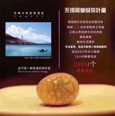 “精選桐木關(guān)絕品金駿眉泡制,海拔1140米農(nóng)家散養(yǎng)土雞蛋,江湖上傳說的牛欄坑肉桂,精選果碳、潮州紅泥炭爐,冬蟲夏草、鐵皮石斛等八味秘制配料,經(jīng)過24小時文火慢煨,12小時靜置而成的——無錫殿堂級茶葉蛋,2899元每顆且限量供應(yīng)。近日,無錫太悅度假酒店公開銷售的茶葉蛋成為了網(wǎng)紅。