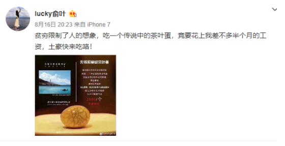 對于該茶葉的走紅,網(wǎng)友議論紛紛。有人認(rèn)為這是嘩眾取寵,和某針管書法家有異曲同工之妙,有人詢問”吃了會上天?“,還有人一口認(rèn)定”這不是洗錢嗎“,也有網(wǎng)友就所謂”精選果碳、潮州紅泥炭爐“提出質(zhì)疑:”再牛逼的木材燒出來的火溫難道還有差別?“,更多網(wǎng)友自嘲,貧窮限制了人的想象,吃一個傳說中茶葉蛋,竟要花上我差不多半個月的工資。