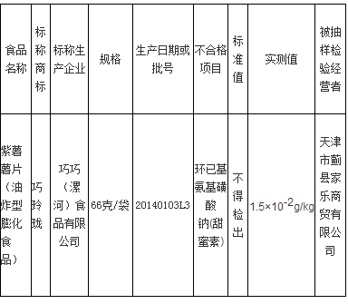經(jīng)檢測,標稱巧巧(漯河)食品有限公司生產(chǎn)的一個批次“巧玲瓏” 紫薯薯片(油炸型膨化食品)(66克/袋 20140103L3)環(huán)已基氨基磺酸鈉(甜蜜素)超標,標準要求不得檢出,實測值為“1.5×10-2g/kg”。