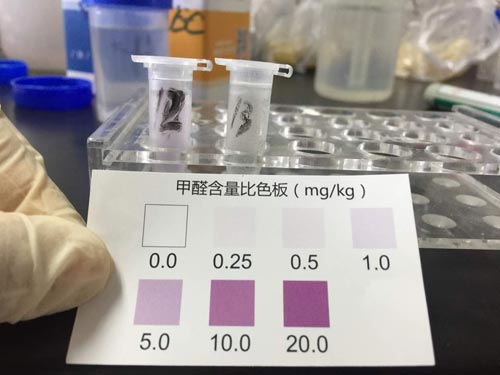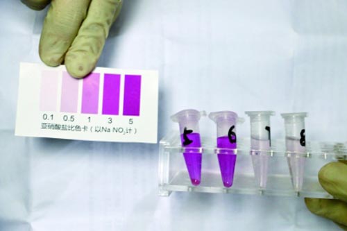 11個樣品檢測液顏色均有變化,均檢出亞硝酸鹽成分。其中5號、6號呈現(xiàn)紫紅色,亞硝酸鹽含量最高,45mg/kg,高于預包裝熟食不得超過30mg/kg的國家限量標準。