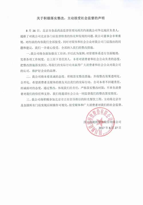在后廚臟亂問題被曝光后,8月25日下午,海底撈先后發(fā)布《關(guān)于海底撈火鍋北京勁松店、北京太陽(yáng)宮店事件的致歉信》、《關(guān)于海底撈火鍋北京勁松店、北京太陽(yáng)宮店事件處理通報(bào)》,承認(rèn)媒體披露的問題屬實(shí),道歉并公布了整改措施。