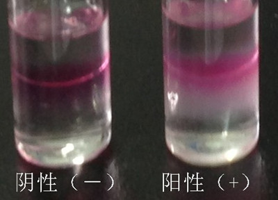 3.樣品檢測:另取一支0.5mL 吸管,吸取試劑C至吸管細部前端約1/4 處(約0.125mL),插入至試劑B瓶的下層溶液中并緩慢排空,觀察B瓶下層溶液中是否產(chǎn)生渾濁絮狀物或沉淀物。