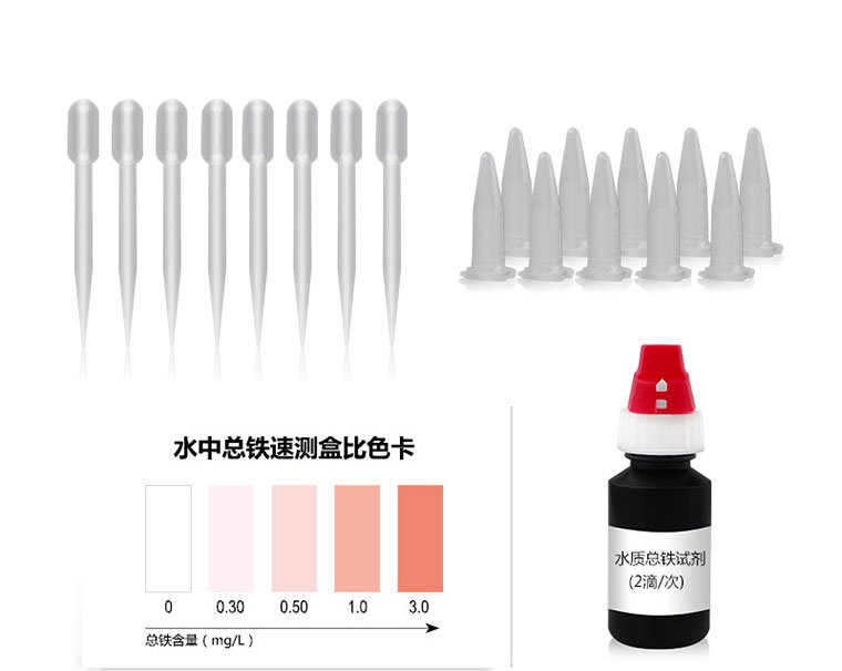 水中鐵離子與檢測試劑反應生成橙紅色物質,含量越高顯色越深。