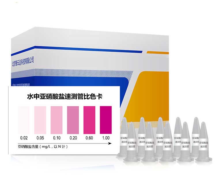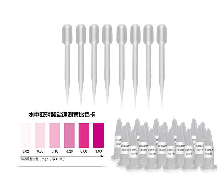 水中亞硝酸鹽與檢測試劑反應生成紅色物質,含量越高顯色越深。