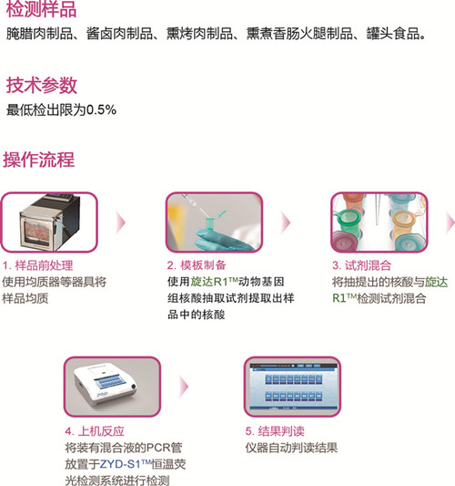 旋達R1?物種鑒定系列試劑,基于恒溫擴增技術(shù)平臺,以特別設(shè)計的2對特異性識別檢測靶標的獨有基因序列,能快速、準確地鑒定檢測出樣品中是否含有特定動物源成分,為識破食品摻假的違法活動提供有力依據(jù)。