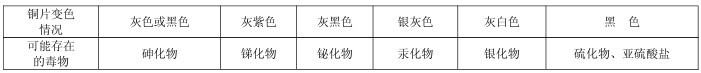 瓶放在電熱板上,調(diào)節(jié)溫控旋鈕使樣液微沸約 10 分鐘(驅(qū)除硫化物的干擾),此時(shí)加入 2 片銅片,保持微沸約 20 分鐘。注意隨時(shí)補(bǔ)加熱水,保持體積不變。若加熱 30 分鐘后銅片表面未變色,可否定砷、汞的存在,如銅片變色,可按下表推測(cè)樣品中可能存在的化合物,并可采取相應(yīng)措施加以處理。保留陽(yáng)性樣品,有條件時(shí)分別加以確證。