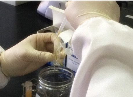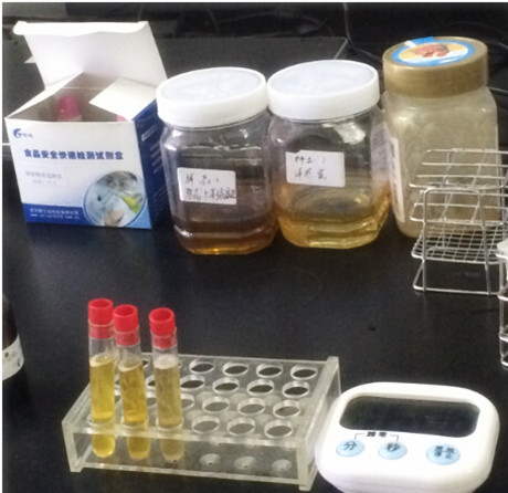 1、取一支檢測(cè)管,加入約 1mL 蜂蜜樣品,加入約 3mL 的純凈水,振搖混溶,滴入 3 滴速測(cè)液,搖勻。