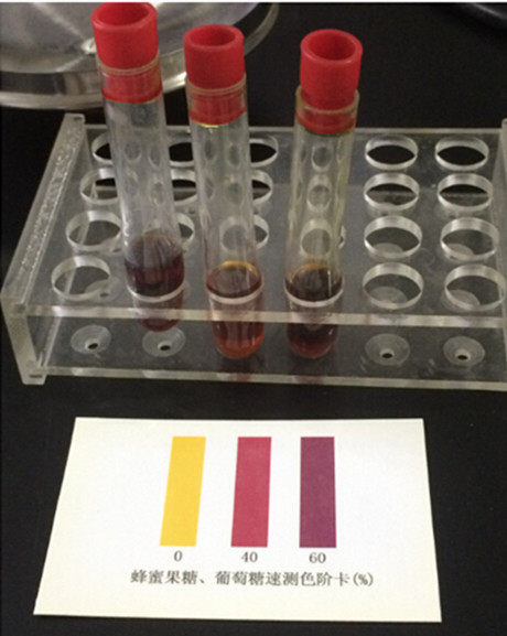 4.把樣品顯色管與果糖和葡萄糖比色卡比對(duì),即可讀出樣品中果糖和葡萄糖的含量。1、3管為樣品,均大于60%,符合國家標(biāo)準(zhǔn)。