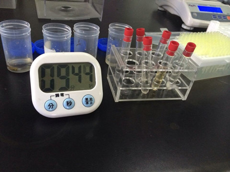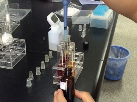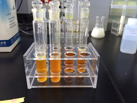 2、取6根試管,1-5號(hào)試管作為樣品管,6號(hào)為對(duì)照管。在樣品管加入3ml樣品液,在對(duì)照管中加入3ml緩沖液,隨后分別加入20ul顯色劑和50ul酶試劑,蓋塞混勻靜置10min。