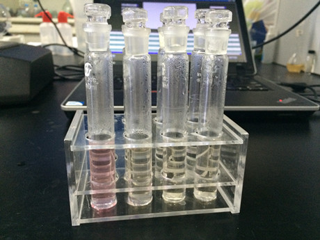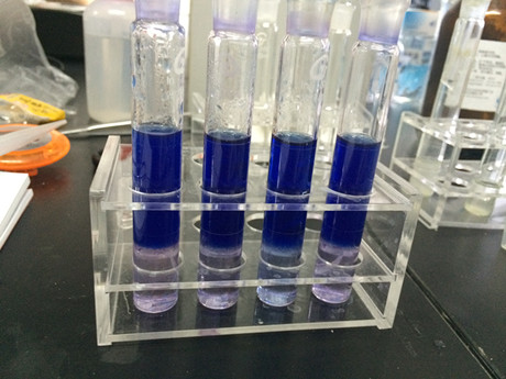 3、樣品管:取制備好的樣品液加入A溶液1mL,搖勻,加入三氯甲烷4mL,蓋上塞子,較為快速顛倒20次,靜置5min,取下層溶液進(jìn)行檢測。