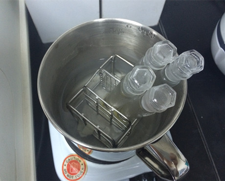 3、樣品管:吸取2mL樣品處理液于10mL比色管中,加入2mL山梨酸試劑一,加上蓋子,搖勻,于沸水浴中加熱7分鐘,立即加入2mL山梨酸試劑二,搖勻,繼續(xù)沸水浴加熱10分鐘,取出涼水冷卻3分鐘。