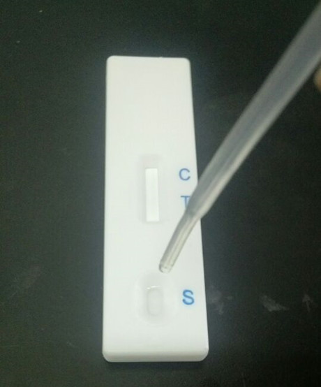 1、從包裝袋中取出試紙卡,打開后平放在桌面上,用吸管吸取待檢樣品溶液,滴加 3 滴于加樣孔中,加樣后開始計(jì)時(shí)