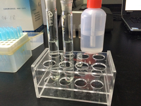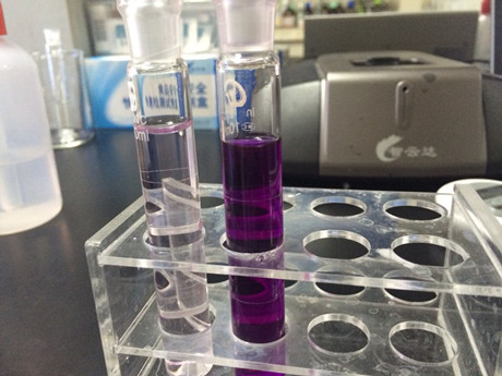 4、取一支10mL比色管,加入1mL樣品液,加入C溶液80μL,加蒸餾水至10mL刻度線,加入D溶液0.5mL,搖勻,開(kāi)蓋靜置10min。