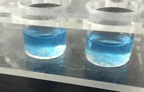 然后再滴加6滴油樣,加入1ml試劑2,搖晃震蕩10秒左右,使其混合均勻,然后靜置10分鐘左右,觀察上層清液,如若不在為藍色,或者有白色絮狀物產(chǎn)生,則為地溝油。