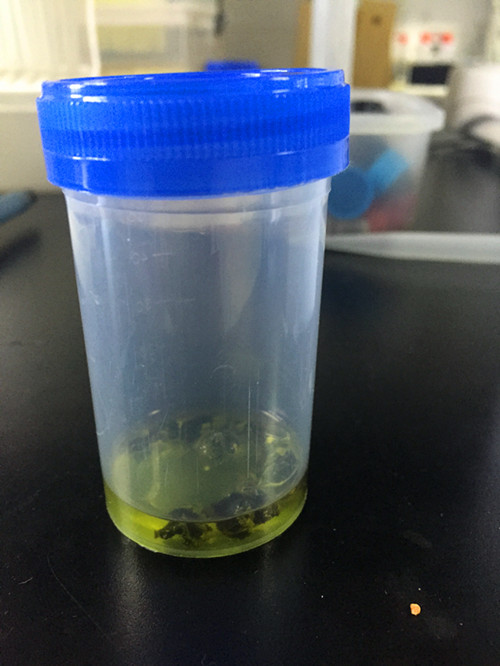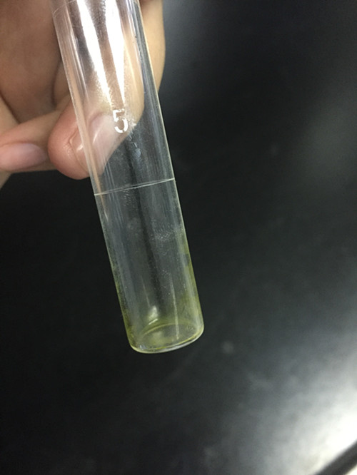 待上層容易清澈后,用移液槍移取0.5ml提取液到比色管中,之后用洗耳球吹干丙酮,得到附著于比色管壁的綠色物質(zhì);