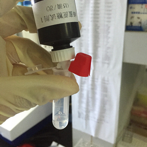 用0.2ml塑料吸管取待測液滴加1滴到另一離心管中,滴入15滴蔗糖試劑1,蓋上管蓋,上下?lián)u動 6 次。