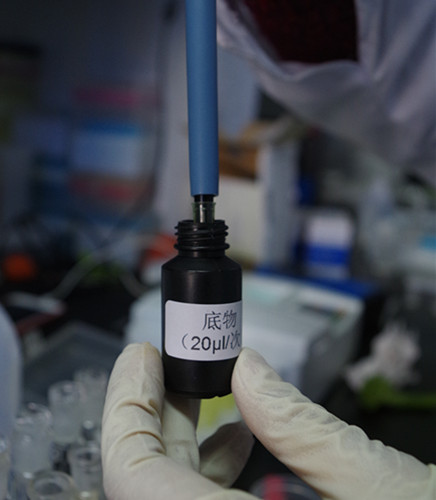 在離心管中,用移液槍依次加入4 mL緩沖液,20 μL顯色劑和50 μL酶,搖勻,靜置10 min。然后用移液槍加入20 μL底物。搖勻后立即轉(zhuǎn)移到比色皿中,放入儀器(通道1)。