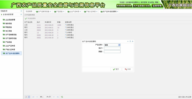 主要功能包括:碼段申請(qǐng),政府審核,追溯碼段分配,追溯標(biāo)識(shí)管理等。