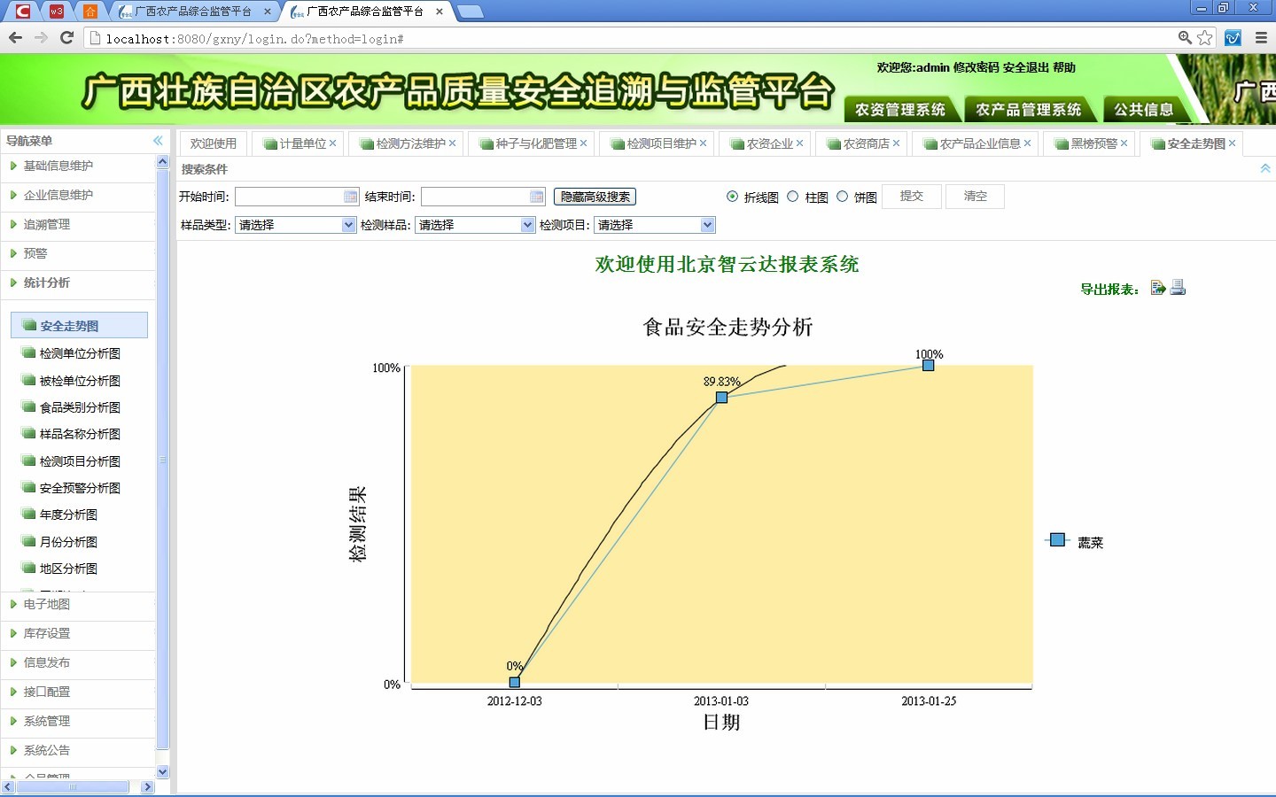 1.1檢測(cè)數(shù)據(jù)預(yù)警 、安全走勢(shì)分析統(tǒng)計(jì) 、檢測(cè)單位分析統(tǒng)計(jì) 、被檢單位分析統(tǒng)計(jì) 、產(chǎn)品類別分析統(tǒng)計(jì)、專項(xiàng)產(chǎn)品分析統(tǒng)計(jì)、專項(xiàng)項(xiàng)目分析統(tǒng)計(jì)、指令預(yù)警分析統(tǒng)計(jì)、省內(nèi)年度分析統(tǒng)計(jì)、省內(nèi)月份分析統(tǒng)計(jì)、監(jiān)管地區(qū)分析統(tǒng)計(jì)、同期比對(duì)分析統(tǒng)計(jì)等統(tǒng)計(jì)功能。安全走勢(shì)統(tǒng)計(jì)功能如圖1-1所示