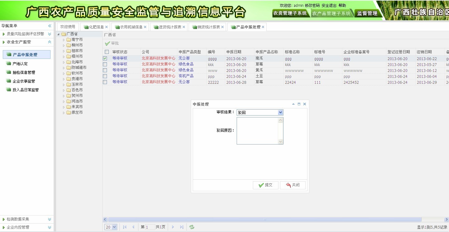 監(jiān)管部門負(fù)責(zé)處理三品產(chǎn)品的認(rèn)證審核。審批結(jié)果包括通過和駁回,如此申報(bào)駁回需填寫駁回原因。如圖2-1所示