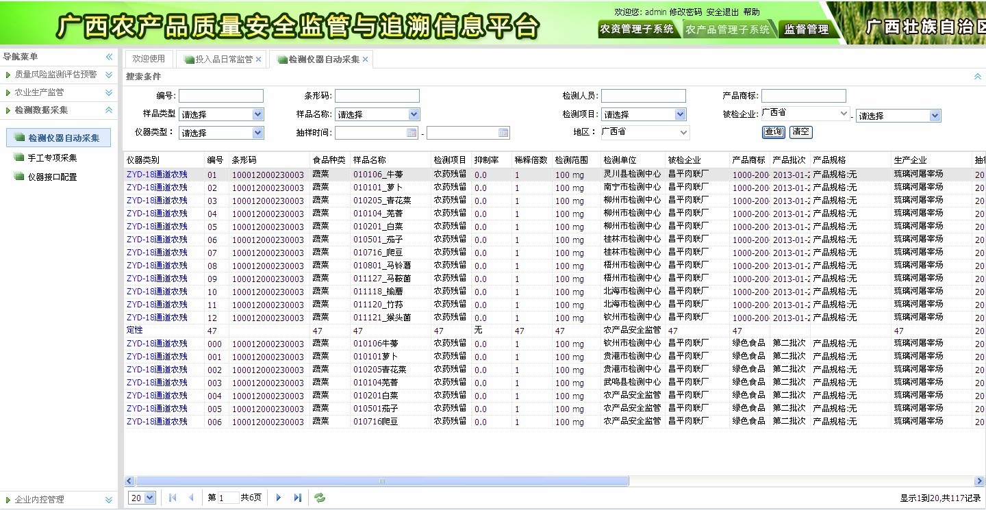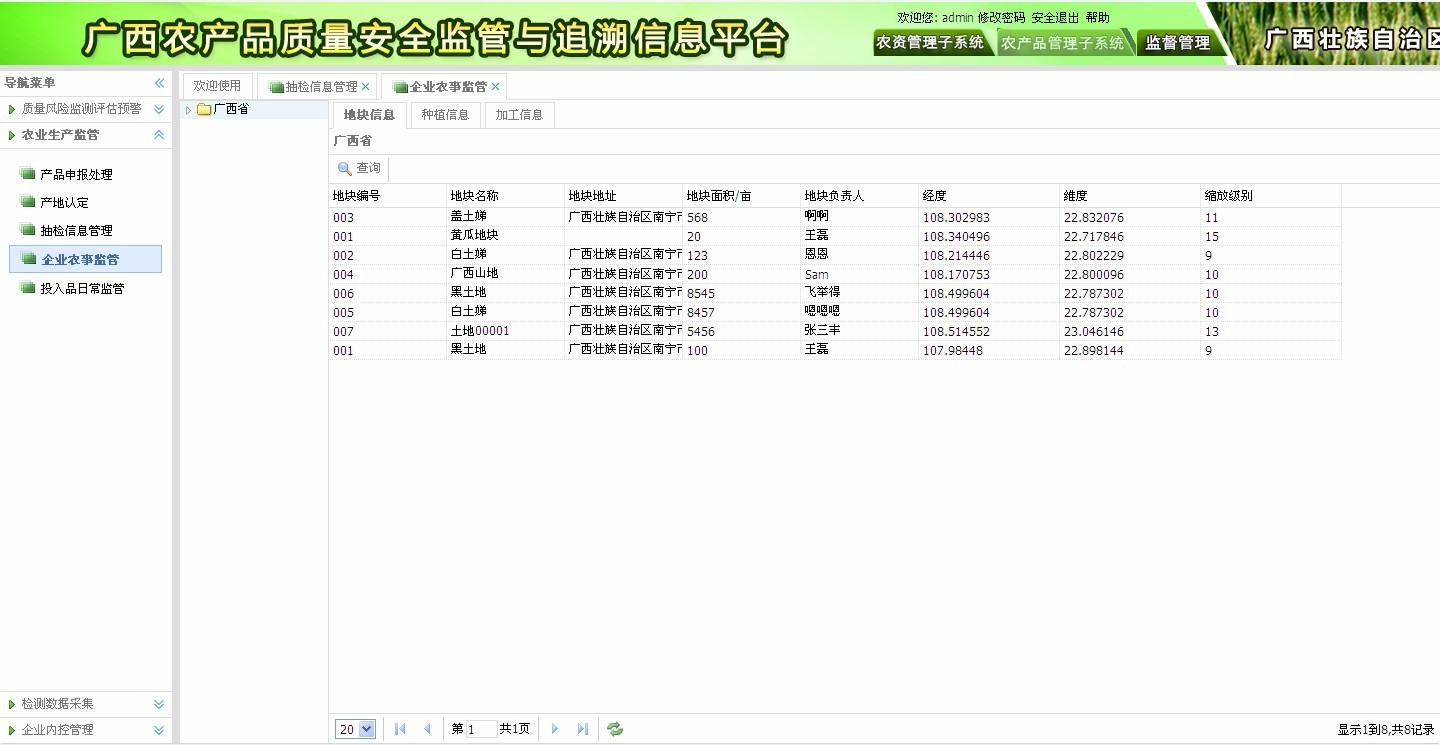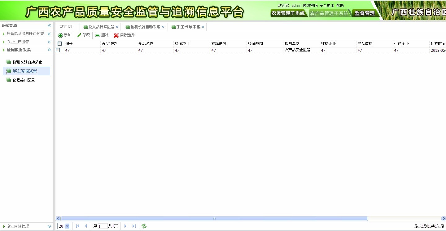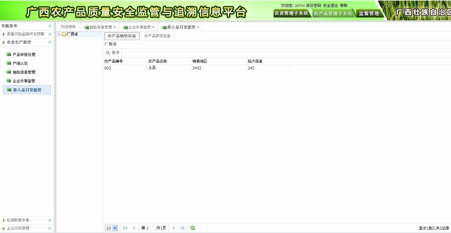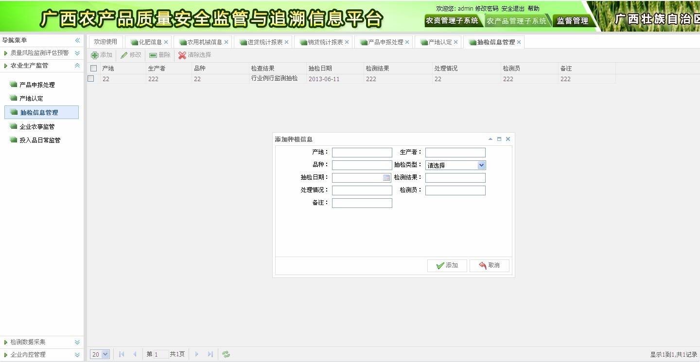 ? 抽檢信息管理:行業(yè)例行監(jiān)測(cè)抽檢,專項(xiàng)風(fēng)險(xiǎn)監(jiān)測(cè),所含信息包括產(chǎn)地、生產(chǎn)者、品種、檢測(cè)結(jié)果、處理情況、檢測(cè)員等信息。如圖2-3所示