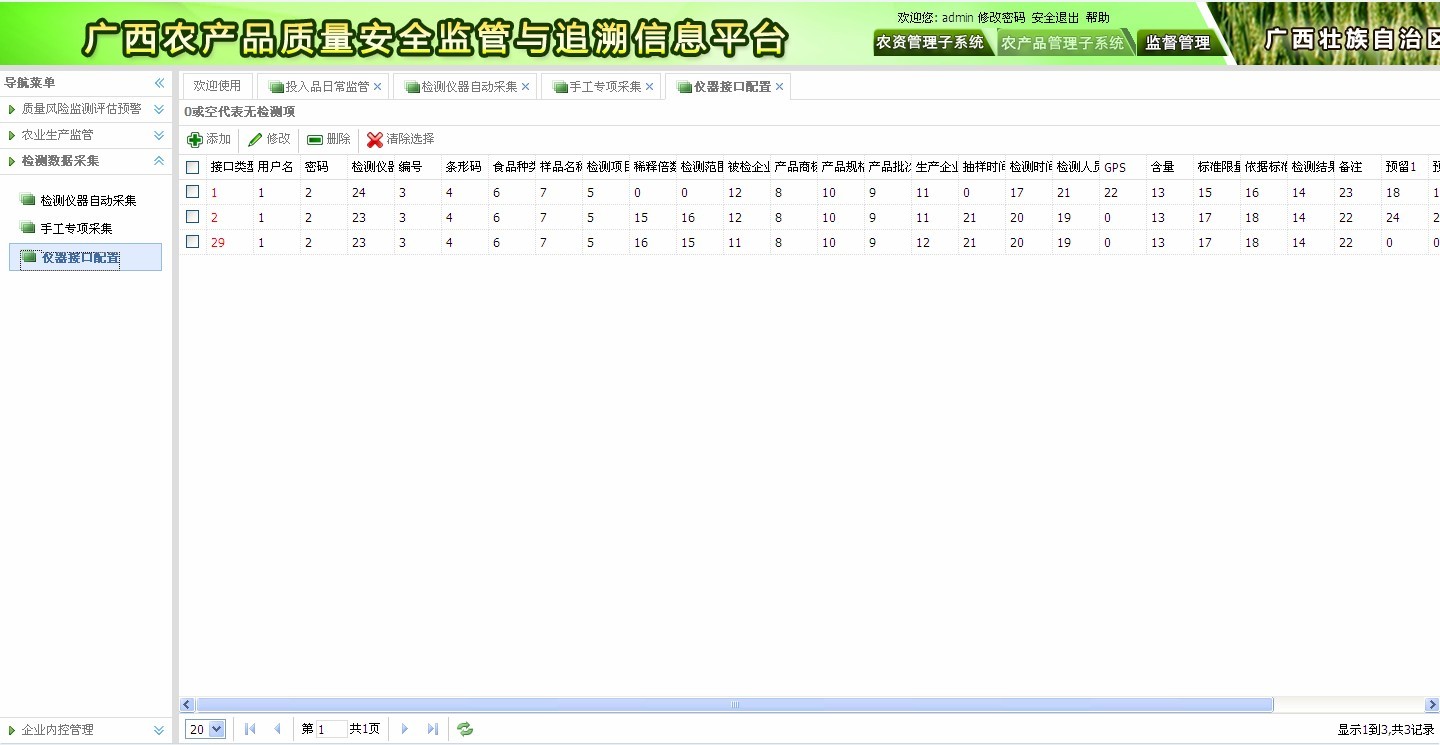 ? 系統(tǒng)跟儀器對(duì)接,傳輸檢測(cè)數(shù)據(jù)入庫。并能根據(jù)數(shù)據(jù)自動(dòng)統(tǒng)計(jì)分析。支持多種類儀器,縱向支持區(qū)、市、縣、鄉(xiāng)農(nóng)產(chǎn)品檢測(cè)監(jiān)控工作的資源共享,橫向預(yù)留與食品安全監(jiān)管部門數(shù)據(jù)共享接口。如圖3-1所示